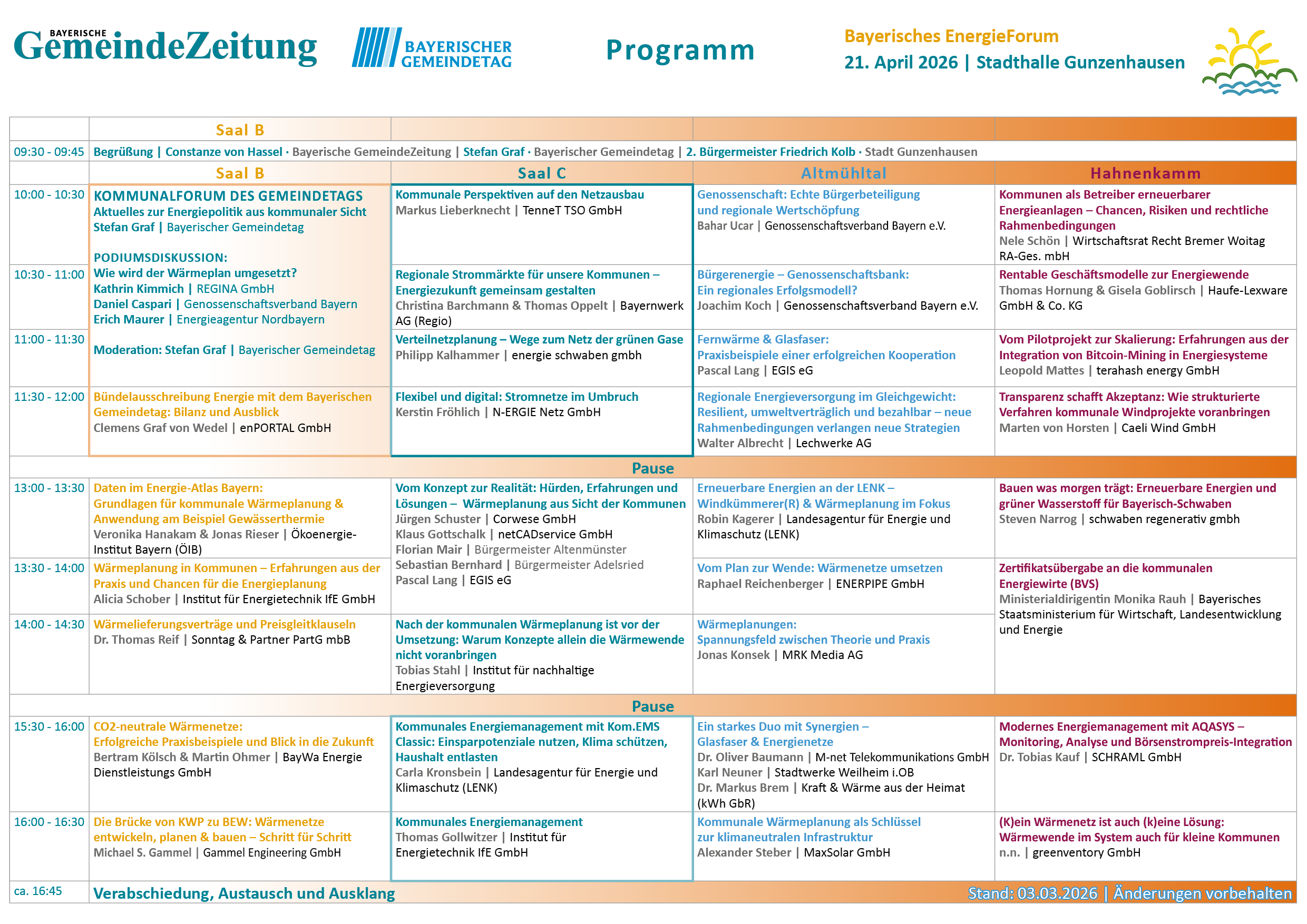Bayerisches Staatsministerium für Wirtschaft, Landesentwicklung und Energie ◦ Bayerngrund GmbH ◦ Bayernwerk Netz GmbH ◦ BayWa Energie Dienstleistungs GmbH ◦ BKWP Wiedemann und Baumann GmbH ◦ Corwese GmbH ◦ Crea Tech Engineering GmbH ◦ Dornier Group GmbH ◦ EGIS eG ◦ energie schwaben gmbh ◦ energielenker projects GmbH ◦ Energiewende Oberland ◦ ENERPIPE GmbH ◦ enPORTAL GmbH ◦ Genossenschaftsverband Bayern e.V. ◦ GEO DATA GmbH ◦ GP JOULE GmbH ◦ greenventory GmbH ◦ HST Systemtechnik GmbH & Co. KG ◦ KOM2KOM GmbH ◦ Landkreis Regensburg ◦ LATUS consulting AG ◦ Lechwerke AG ◦LfA Förderbank Bayern ◦ LFU - Bayerisches Landesamt für Umwelt ◦ N-ERGIE Netz GmbH ◦ Orsted Onshore Deutschland GmbH ◦ Qair Deutschland GmbH ◦ REHAU Industries SE & Co. KG ◦ RIWA Memmingen ◦ SCHRAML GmbH ◦ SenerTec Center Mainburg GmbH ◦ Sonntag & Partner PartG mbH ◦ SWM Infrastruktur GmbH & Co. KG ◦ Tennet TSO GmbH ◦ terahash.energy GmbH ◦ Tyczka Energy GmbH ◦ VSB Neue Energien Deutschland GmbH ◦ Wirtschaftsrat Recht Bremer Woitag RA-Ges. mbH